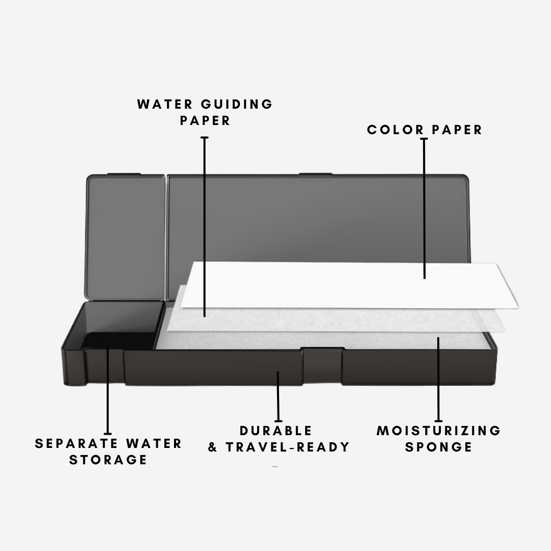 Soak sponge, place paper, add paint — the palette keeps colors workable for hours, solving wasted pigment and making every session smoother and more enjoyable. Paint better.